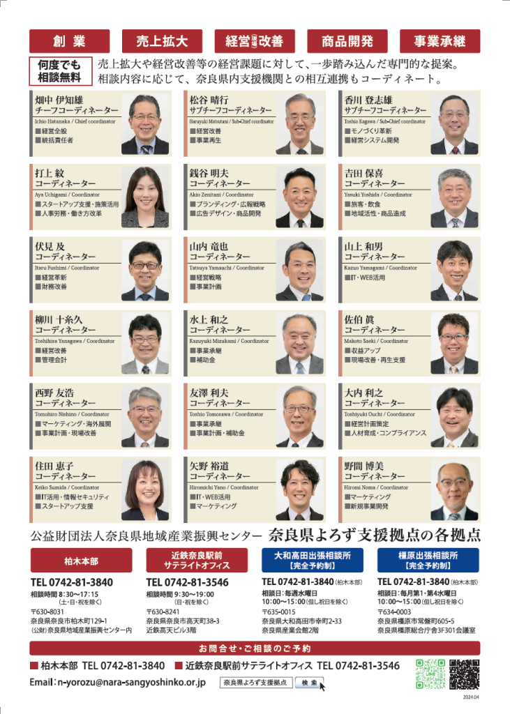 ~お知らせ~ 奈良県よろず支援拠点のご紹介 2024.10.112026.03.02 奈良県よろず支援拠点の業務案内を掲載いたします。経営上の課題等がありましたら国が設置した無料の経営相談所『奈良県よろず支援拠点』にご相談ください!! 奈良県よろず支援拠点 https://www.nara-sangyoshinko.or.jp/n-yorozu